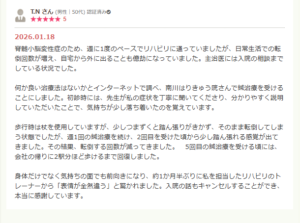 歩行時は杖を使用していますが、少しつまずくと踏ん張りがきかず、そのまま転倒してしまう状態でしたが、週1回の鍼治療を続け、2回目を受けた頃から少し踏ん張れる感覚が出てきました。その結果、転倒する回数が減ってきました。 5回目の鍼治療を受ける頃には、会社の帰りに2駅分ほど歩けるまで回復しました。